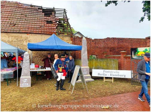 Zur Öffentlichkeitsarbeit gehört weiterhin das Aufstellen von sogenannten Lehr- und Lerntafeln an den Meilensteinen, wobei die Textinhalte und die Zeichnungen von uns entworfen oder mit uns abgestimmt wurden. Im Berichtsjahr sind bis jetzt an zwei Meilensteinen an der B1 sowie einem an der B5 im Land Brandenburg Erläuterungstafeln aufgestellt worden. Auch an dem Ensemble von Meilenstein und Straßenwalze in Demmin-Südost wurden die Tafeln gegen neue ausgetauscht. Außerdem ist die Erneuerung der Erläuterungstafeln an der Alten Hamburger Poststraße nordwestlich von Berlin im Gange. Auch an dem mecklenburgischen Meilenstein in Reppelin wird in Kürze die alte gegen eine neue Tafel ausgetauscht. An dieser Stelle sei darauf hingewiesen, dass unsere Forschungsgruppe außer den genannten Erläuterungstafeln auch Nachgüsse von Platten mit alten Meilenentfernungsangaben und preußischen Adlern herstellt, die an den Meilensteinen angebracht waren bzw. wieder werden.