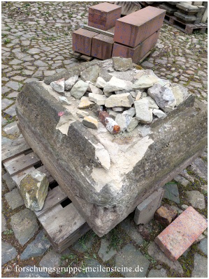 Fundament des Meilenstein nach dem Hochwasser bei den Instandsetzungsarbeiten.
