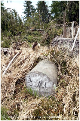 Die beiden unteren Bilder zeigen den wiedergefundenen preußischen Halbmeilenstein