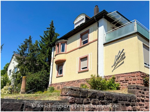 Eine bayrischen Stundensäule auf einem Privatgrundstück in Großheubach (Mainfranken) mit der Inschrift „9 St. von Aschaffenburg“.